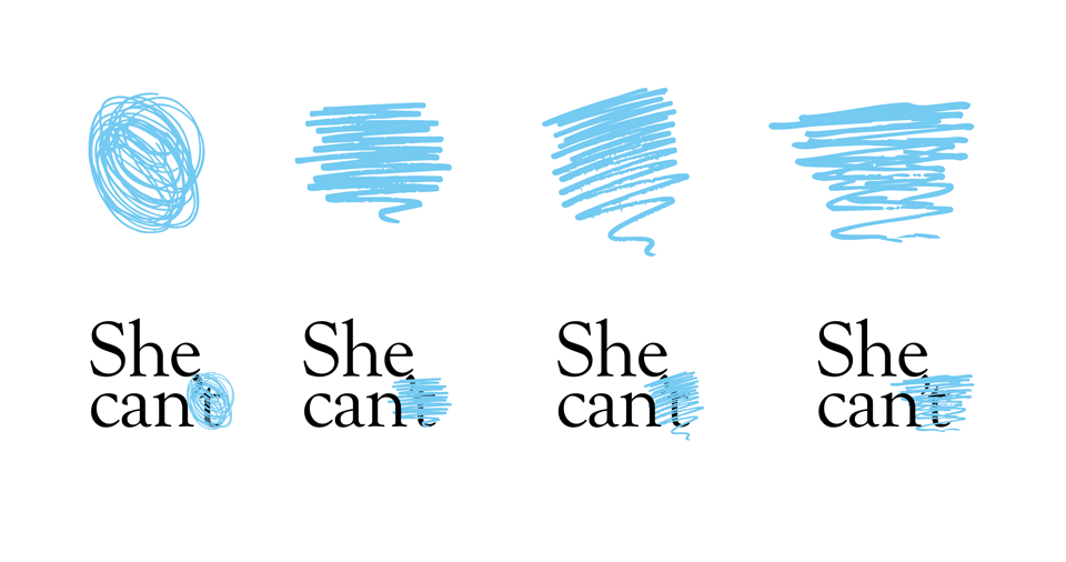 Simply use big bold type which says she can’t, which is startling to the viewer, then crossed out are the ‘t to reveal... She can. The ‘scratching-out scribble blue line’ is by the girl who believes she can. To her there is no can't. Our goal was to make it raw and real, yet simple and bold. This idea is: true, compelling, memorable and valued by the target audiences.